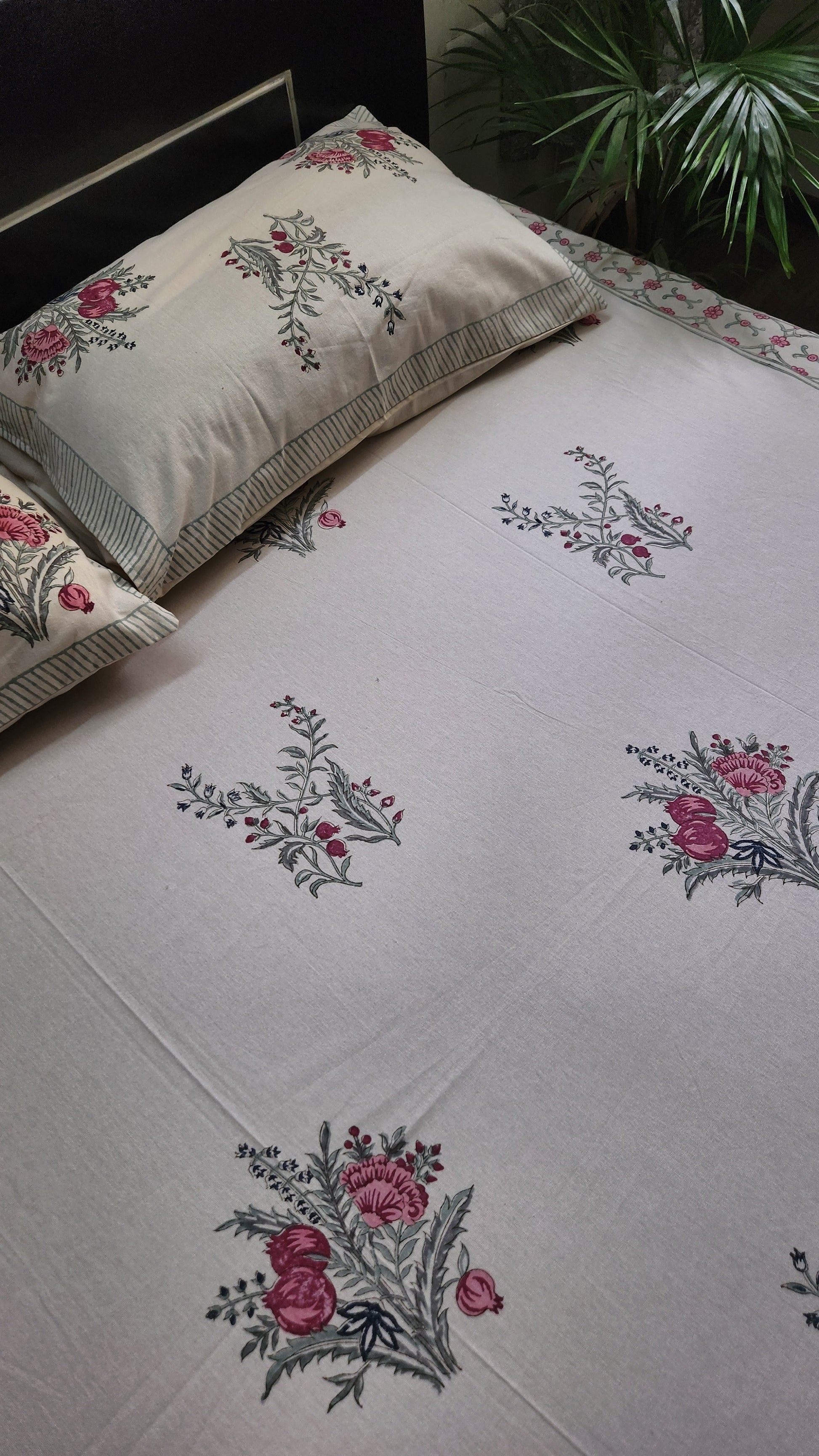 Experience the luxury of our Pink booti Handblock Bedsheet. Made with 100% cotton, this king size bedsheet features a beautiful pink booti handblock print, adding a touch of elegance to your bedroom. Indulge in comfort and style with this premium quality bedsheet.